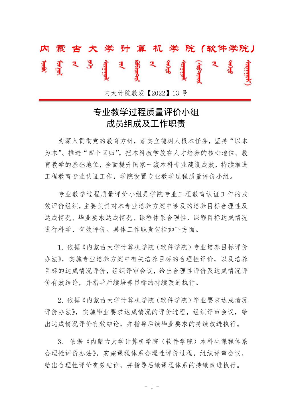 计算机学院(软件学院)专业教学过程质量评价小组工作职责