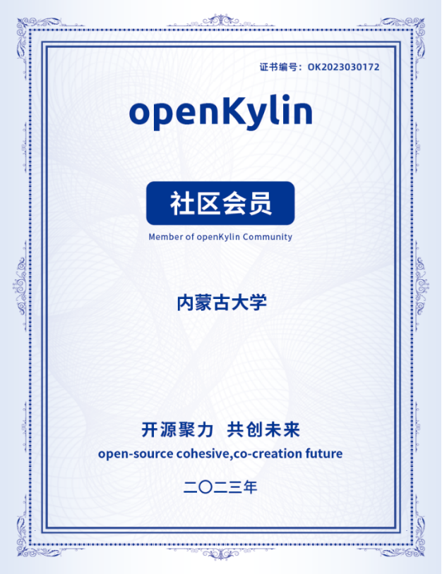 2023年3月15日,内蒙古大学签署openKylin社区CLA(Contributor License Agreement 贡献者许可协议),正式加入openKylin开源社区。