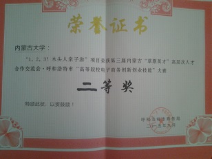我校计算机学院组织了由张献国副教授和贾如老师领队及指导的、由本科生吴陟鹏、吕睿、刘莘源组成的竞赛团队参加了决赛。他们的《123,木头人,亲子游》电子商务创业项目进行了现场演示和答辩。经过激烈角逐,我校代表队获得二等奖。内蒙古创筹网络科技有限公司现场与我校获奖团队达成投资合作意向。