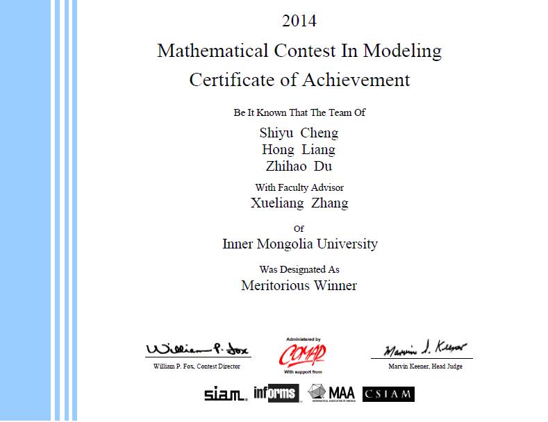 附:2014年美国大学生数学建模竞赛一等奖(Meritorious Winner)获奖证书