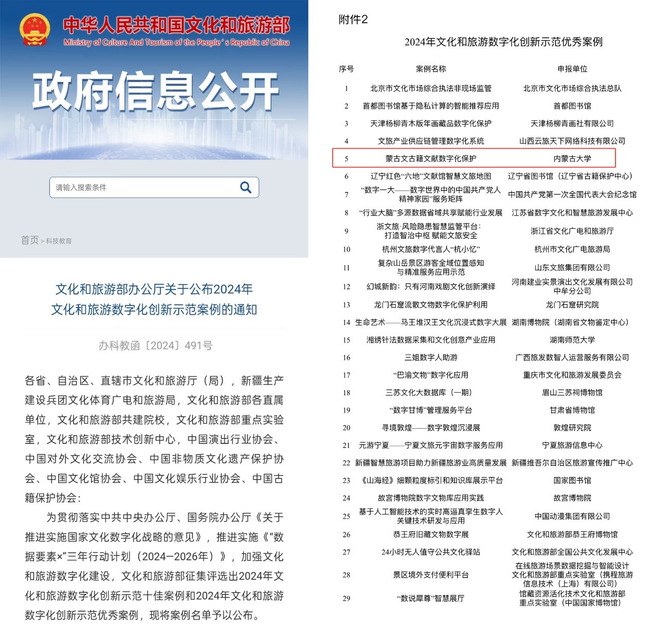 由内蒙古大学牵头申报的“蒙古文古籍文献数字化保护”项目获评2024年文化和旅游数字化创新示范案例。本次评审由中华人民共和国文化和旅游部组织,全国共有29个项目获评优秀案例。本项目旨在贯彻落实习近平总书记在2019年7月16日考察内蒙古大学的重要指示精神:“要加强对蒙古文古籍的搜集、整理、保护,挖掘弘扬蕴含其中的民族团结进步思想内涵,激励各族人民共同团结奋斗、共同繁荣发展。”