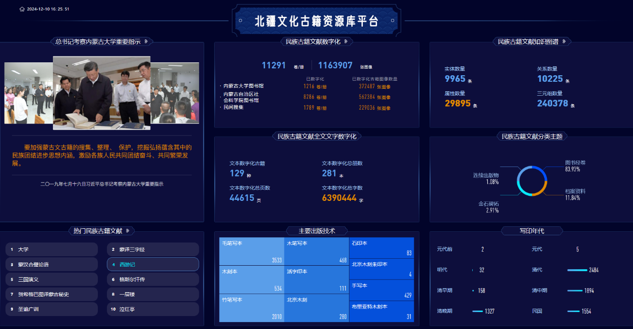 蒙古文智能信息处理技术国家地方联合工程研究中心组织了以飞龙教授为负责人的创新团队,攻克了古籍OCR、图像修复、知识图谱抽取等技术难题,成功开发了一整套蒙古文古籍数字化系统,建成一个数字化存储蒙古文古籍文献最多、检索分析智能化程度最高的 “北疆文化古籍资源库平台”(网址:http://bjwhgj.cn)。该平台包括民族古籍文献综合管理、多文种古籍OCR、古籍文献全文检索、民族古籍文献智能分析、民族古籍文献大数据可视化、古籍文献图像修复系统和民族古籍文献知识图谱等系统。内蒙古大学创新团队联合内蒙古社会科学院与成都联图科技有限责任公司等单位合作数字化了蒙古文古籍11291卷(册),共116.3万张古籍图像;侧重于铸牢中华民族共同体意识选择129部珍贵古籍文献进行全文文字数字化,字数为639万字;建立了24万条古籍文献知识图谱三元组。