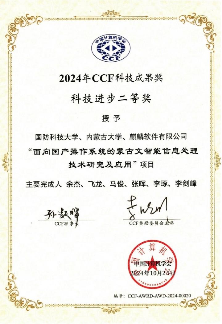 10月25日,CCF颁奖典礼在浙江横店举行。由国防科技大学、内蒙古大学与麒麟软件有限公司共同完成的“面向国产操作系统的蒙古文智能信息处理技术研究及应用”项目荣获2024年度“CCF科技成果奖”科技进步二等奖。