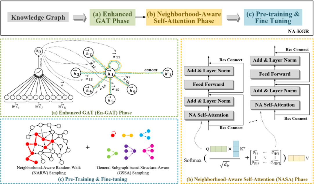 知识图谱推理(Knowledge Graph Reasoning, KGR)是一种通过在已有知识的基础上推断新知识以改善知识图谱不完整性和稀疏性问题的有效方法之一。近年来的研究表明基于图神经网络(Graph Neural Network,GNN)的KGR方法可以获得最优的预测结果。然而,该类方法仍然存在图特征获取不足、引入噪声、忽略路径连通性以及获取邻域信息不完整等问题。基于此,论文提出一种基于邻域感知(Neighborhood- Aware,NA)图自注意力机制的KGR预训练模型NA-KGR(如图1所示)。该模型分为两个阶段:第一阶段是增强的图注意力网络,可以使用其邻居的加权特征来表示和编码最有可能对推理产生积极影响的实体;第二阶段是邻域感知自注意力机制,通过在计算注意分数时增加自适应实体相似度矩阵,可以使模型更有效地从邻域实体中获取信息进行推理。