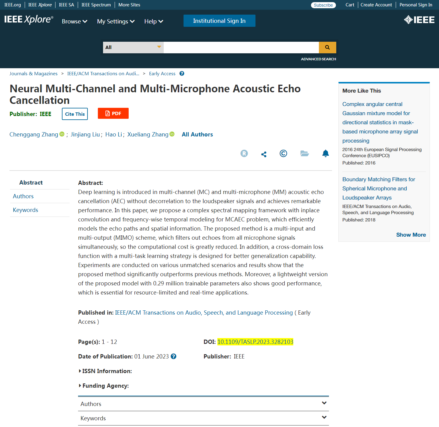 近日,我院张学良教授团队在国际信号处理领域顶级期刊《IEEE/ACM Transactions on Audio, Speech, and Language Processing》上发表了题为“Neural Multi-Channel and Multi-Microphone Acoustic Echo Cancellation”的学术论文(DOI:10.1109/TASLP.2023.3282103)。