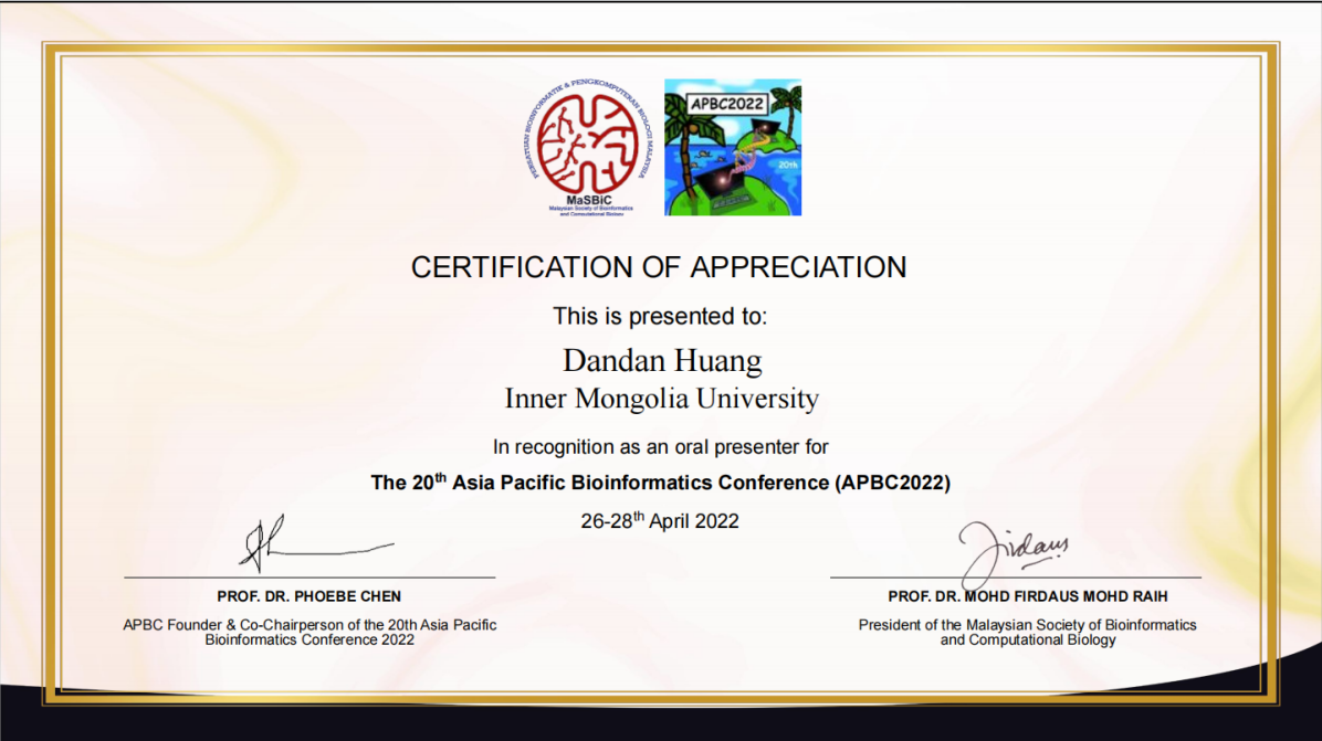2022年4月26日-28日,第20届Asia Pacific Bioinformatics Conference会议在线上举行,黄丹丹同学作为论文主要作者参加会议并进行口头学术报告。