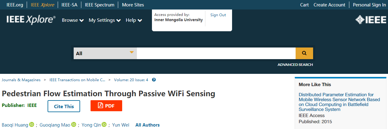 我院物联网团队联合澳大利亚悉尼科技大学、北京交通大学等合作单位,提出采用WiFi嗅探技术解决人群分析难题,取得了重要的研究成果,并以“Pedestrian Flow Estimation Through Passive WiFi Sensing”为题,发表在无线网络和移动计算领域国际顶级期刊《IEEE Transactions on Mobile Computing》(卷号:20,期号:4,页码:1529-1542,下载地址https://ieeexplore.ieee.org/abstract/document/8936381)。《IEEE Transactions on Mobile Computing》是中国计算机学会推荐的A类期刊,同时是中科院SCI期刊分区为一区TOP期刊,影响因子5.112。