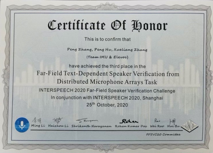我院张学良教授团队联合大象声科有限公司参加由昆山杜克大学、新加坡国立大学、美国南加州大学与AISHELL合作举办的INTERSPEECH 2020 (Conference of the International Speech Communication Association) 远场声纹挑战赛 (Far-Field Speaker Verification Challenge) 的文本相关多麦克风阵列任务中,排名国际第三。相关文章被interspeech 2020接收。作者分别为我院研究生张鹏,大象声科胡鹏和张学良。