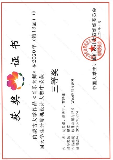 2020年8月27日,2020年(第13届)中国大学生计算机设计大赛落下帷幕,我院派出的三支参赛队全部入围国赛决赛,其中,由崔波任指导教师,黄姚佳、侯佩昕、崔泽源组成的参赛队获得全国二等奖;由崔波任指导教师,刘昱琨、董静钰、洪欣宇组成的参赛队和由张学良任指导教师,杨涵、崔泽源、庞靖组成的参赛队均获得全国三等奖。