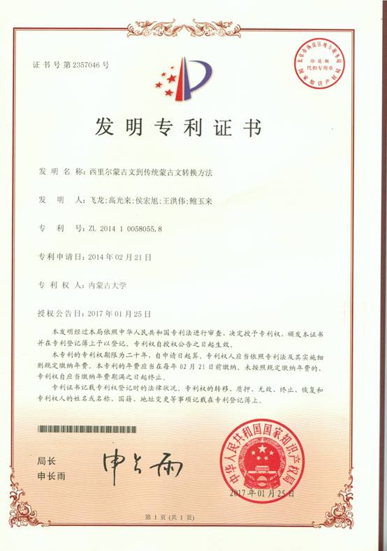 2017年1月25日,计算机学院蒙古文信息处理技术实验室授权了一项发明专利“西里尔蒙古文到传统蒙古文转换方法”,专利号为:ZL201410058055.8,发明人:飞龙(副教授),高光来(教授),侯宏旭(教授),王洪伟(硕士生,导师为高光来 教授),鲍玉来(副研究馆员)。