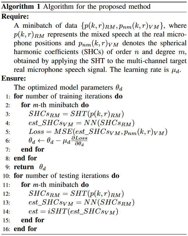 摘要:传统波束形成算法的性能依赖于麦克风数量,通常随着麦克风数量的增加,性能得以提升。然而,在实际应用中,麦克风的数量往往是有限的。为此,本文提出了一种创新的虚拟麦克风估计方法,该方法结合了传统波束形成技术与基于神经网络的球谐变换(SHT)方法的优势,克服了各自的局限性。具体而言,我们的方法通过预测虚拟麦克风位置的SHT系数,并将其反变换为虚拟语音信号,从而有效地利用球谐域中的空间信息,提升虚拟麦克风估计的准确性和效率。针对开放的MS-SNSD数据集进行的评估结果表明,所提出的方法在性能上明显优于现有基准方法。算法描述如下: