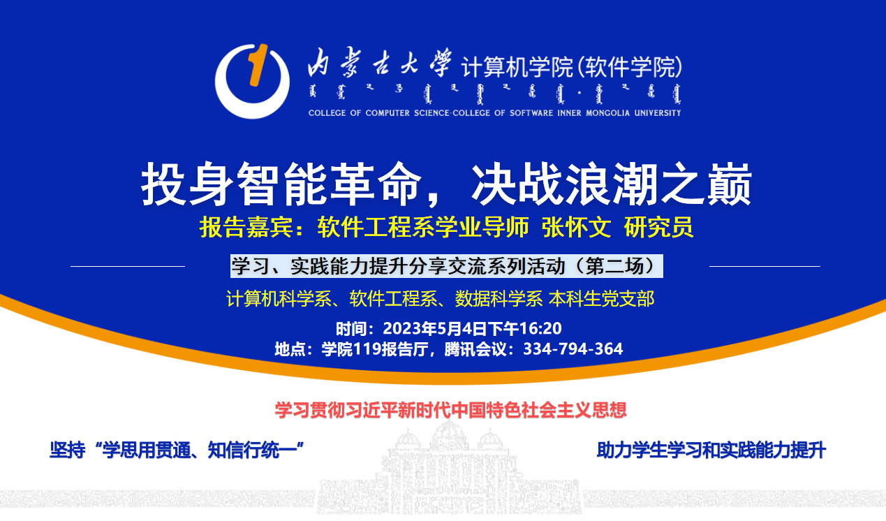 为扎实开展学习习近平新时代中国特色社会主义思想主题教育工作,激发我院学生的学习热情、提升创新实践能力,我院计算机科学系、软件工程系和数据科学系共4个本科生党支部于202354日下午4:20在学院119报告厅联合开展“今日五四青年节听报告,明朝展身手大有可为”主题党日活动。活动邀请我院“骏马计计划”B1岗优秀拔尖人才、软件工程系本科生学业导师张怀文研究员作“投身智能革命,决战浪潮之巅”的专题报告,计算机科学系本科生党支部书记卢慧主持。