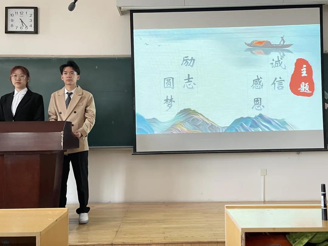班会分为诚信感恩和励志圆梦两个模块进行,由主持人引出活动主题并进行介绍。