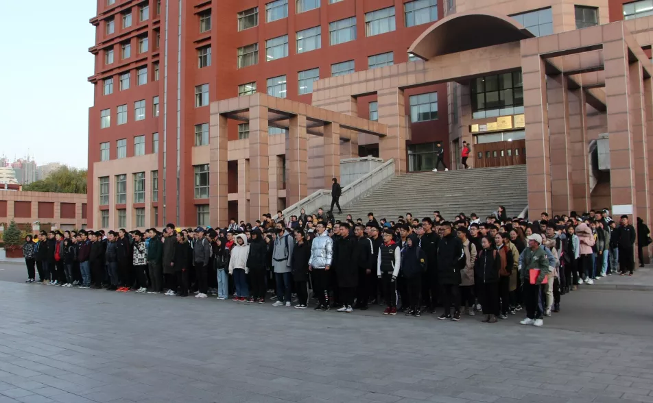 内蒙古大学综合楼前,金黄的落叶上凝结着秋霜,在阳光的照耀下闪烁着银光,朝阳下,夹杂着阵阵秋意,同学们展现出青春的朝气。