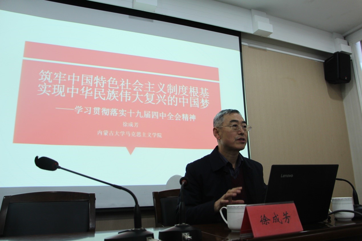 本次学习会,特邀我校学习宣传贯彻党的十九届四中全会精神理论宣讲团成员、我校马克思主义学院徐成芳教授作专题辅导讲座。徐成芳教授对党的十九届四中全会召开的背景、重要意义、《决定》的重要内容等作了全面、深入、系统的讲解,为与会同志深刻全面领会十九届四中全会精神奠定了坚实基础。
