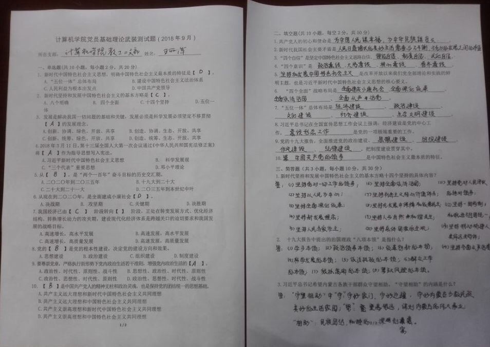 最后,全体与会党员参加了《计算机学院党员基础理论武装测试题》的答题活动,通过答题环节,支部党员同志们表示对习近平新时代中国特色社会主义思想和党的十九大精神有了更为深入地理解和体会。