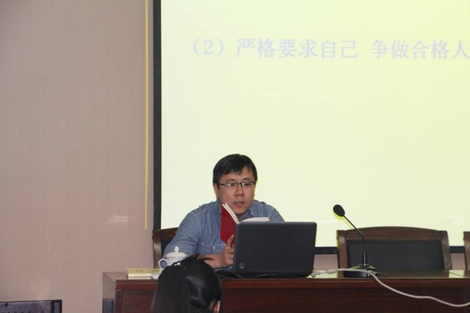 首先,孙涛老师带领大家温习了《中国共产党章程》,从总纲展开讲述,针对入党誓词、党员的义务、党员的权利、党的组织制度和纪律等做了详细的讲解。他表示,党章是中国共产党树立的旗帜,集中体现了党的性质宗旨、政治主张、奋斗理想,以及对党员的基本要求,确定了党的重要制度,对推进党的事业、加强党的建设具有重要的指导作用。学习并遵守党章能有效的加强党员意识。他要求大家不断重温党章党规,进一步明确做合格党员的标准。其次,孙涛老师对《中国共产党廉洁自律准则》和《中国共产党纪律处分条例》做了介绍,他强调学生党员尤其是学生党员干部要秉持“先公后私 克己奉公 清白做人 勤俭节约 吃苦在前 享受在后”的行为规范,发挥先锋模范带头作用。接下来,孙涛老师为大家阐述了习近平总书记系列讲话涉及的内容,他指出,习总书记系列重要讲话深刻回答了新的历史条件下党和国家发展的一系列重大理论和现实问题,是中国特色社会主义理论体系最新成果,把握了时代的趋势,顺应人民的期待,富有智慧和哲理,我们必须深入学习和思考。最后,孙涛老师针对如何做一名合格的学生党员对大家提出三点要求:一、努力学习,加强自我修养,做好本职工作;二、积极参加活动,提高综合素质,克己奉公,多做贡献;三、讲纪律,讲团结,讲正气,讲文明。他强调“两学一做”基础在学,关键在做。需要每一位党员长期坚持将党章党规以及习近平总书记系列讲话作为精神指引,坚定理念和信念,将“两学一做”内化于心,外化于行。